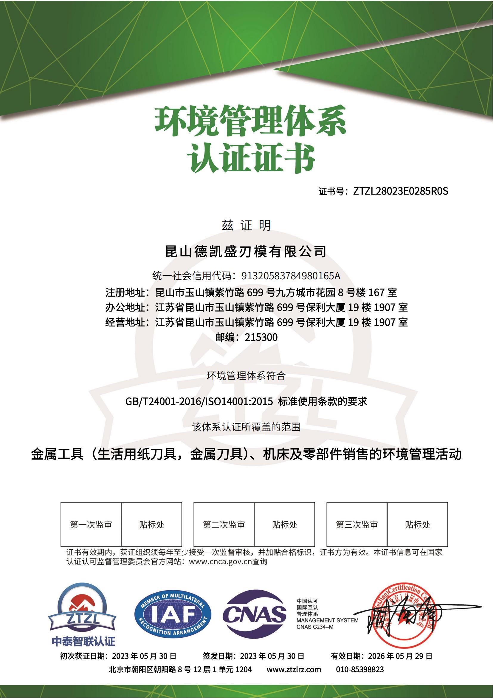 环境管理体系认证证书